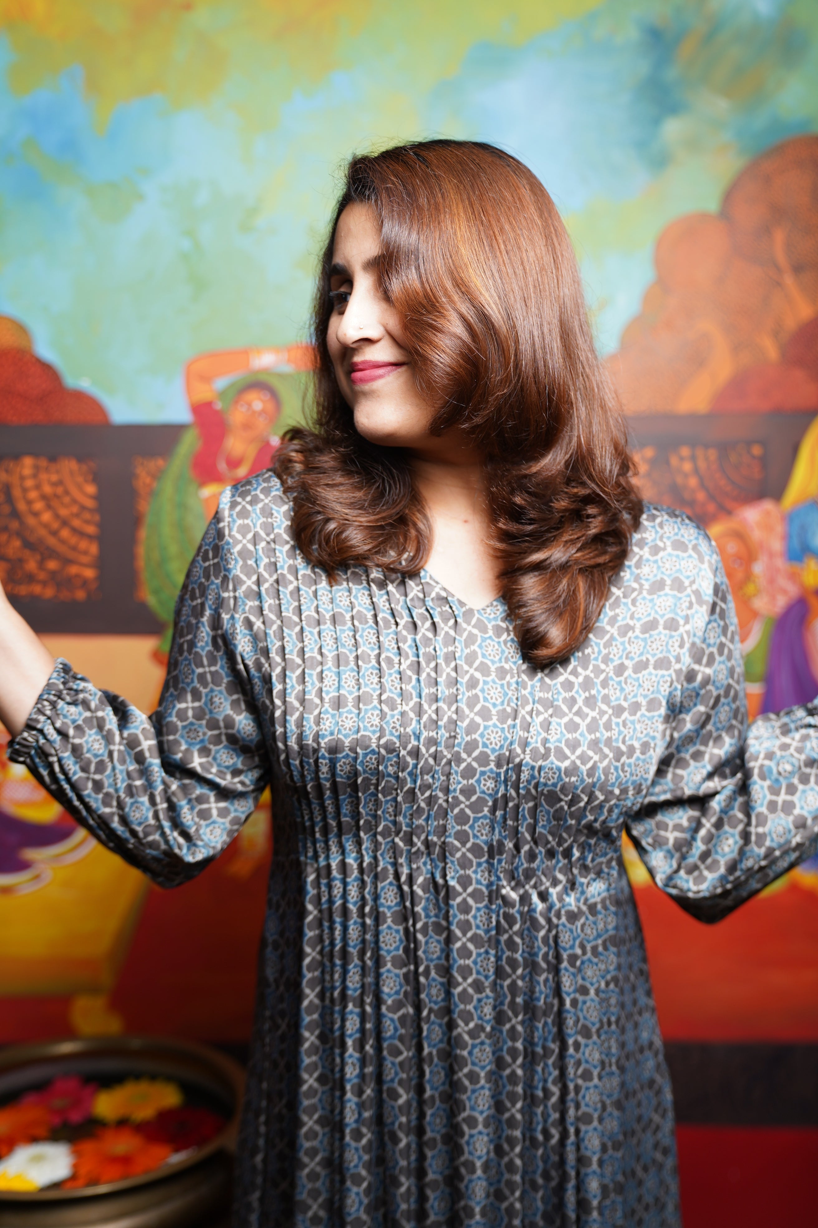 Hand block printed Modal Silk Pintuck Aline Princess cut Kurthi