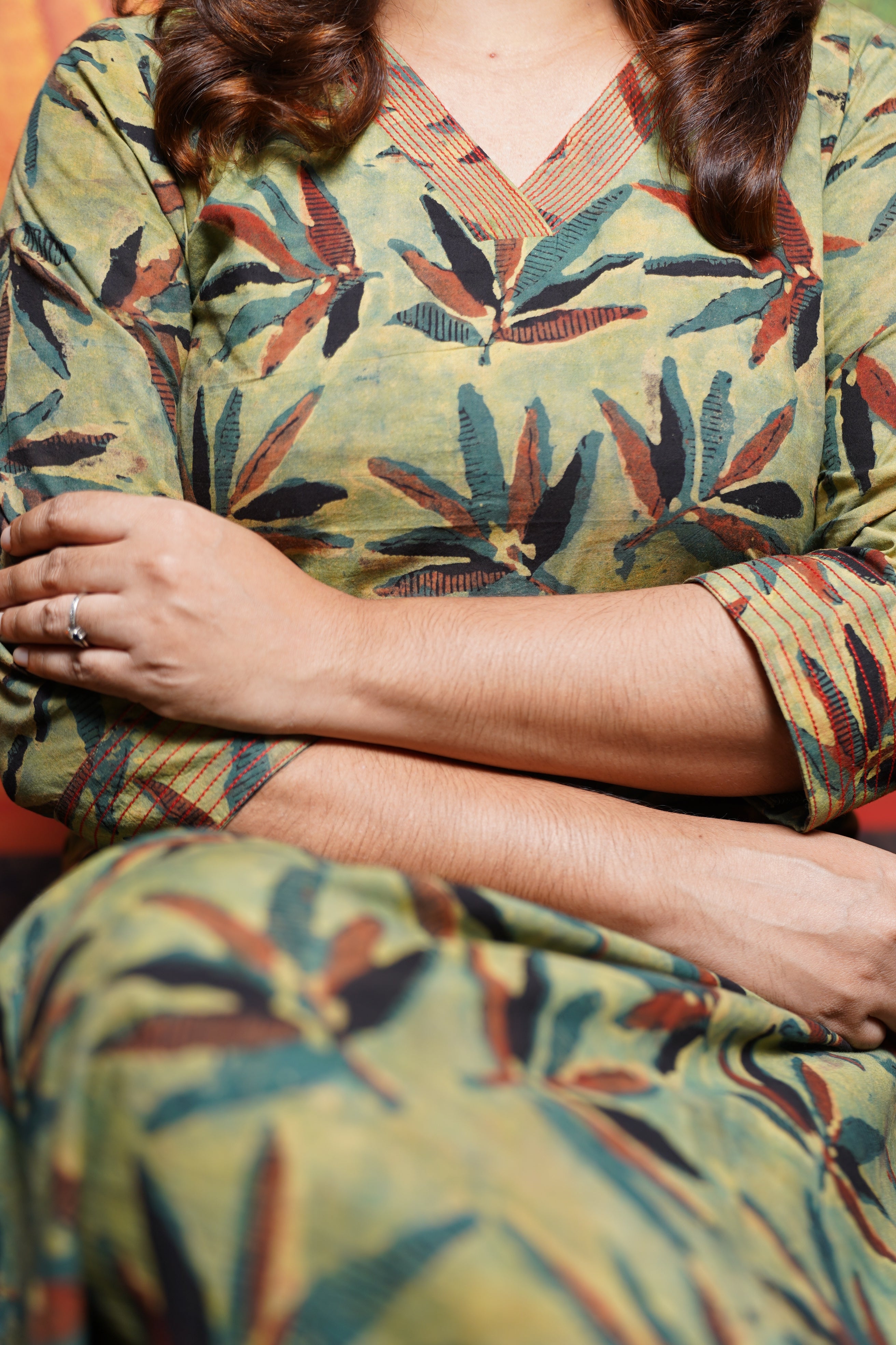 Hand Block Printed Vanaspathi Cotton Straight Cut Kurthi Set Crafted from premium Vanaspathi cotton, this kurthi set showcases traditional hand block printing techniques that celebrate artisanal craftsmanship. The straight-cut silhouette offers comfortable, flattering wear for everyday occasions. Distinctive running thread detailing adorns the sleeves and neckline, adding refined textural interest and visual depth. The natural breathability of cotton ensures all-day comfort in warm climates, while the timeless design pairs effortlessly with traditional or contemporary styling. A versatile wardrobe essential that honors heritage weaving traditions.